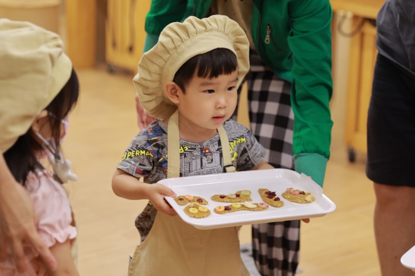 信誼親子館專為小小孩設計的小廚師活動,讓小寶貝穿上小小廚師服,體驗cooking樂趣!從認識食材開始,讓孩子自己拌入奶油、加入餅乾粉,再用力的攪拌均勻,然後捏出獨特造型的餅乾!