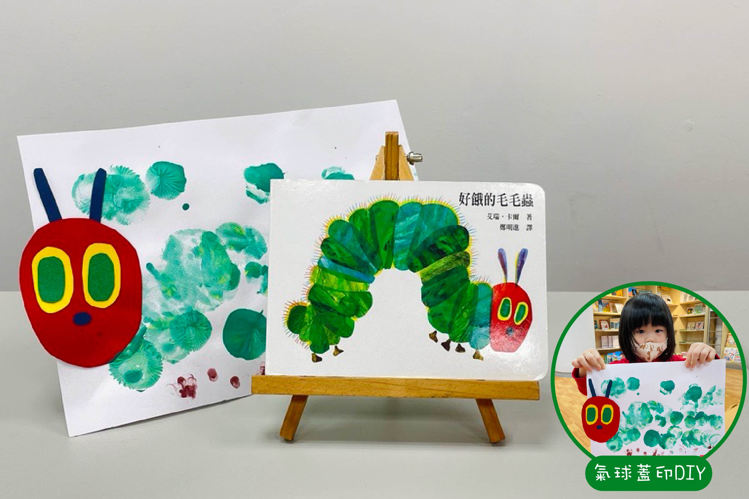 來聽故事囉《好餓的毛毛蟲》汽球碰碰印彩蟲(台中場)小孩們最喜歡的《好餓的毛毛蟲》來囉! 鑽進鑽出、毛毛蟲忙得不得了,一個洞、二個洞… 不停地吃吃吃,肥嘟嘟的,牠究竟什麼時候才吃飽? 聽完故事用小氣球上顏料,在紙上碰碰跳跳、畫出一節節的毛毛蟲身體,用手指頭畫上毛毛蟲的腳腳!
