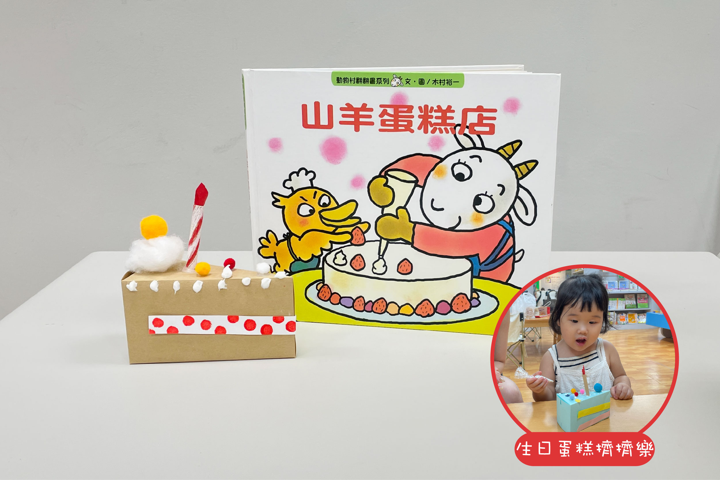 來聽故事囉《山羊蛋糕店》生日蛋糕擠擠樂(台中場)歡迎光臨「山羊蛋糕店」! 鬆餅、蛋糕捲、栗子蛋糕、草莓生日蛋糕……今天,你想要吃什麼樣的甜點呢? 聽完故事,動動小手,擠上奶油做出一個繽紛的夢幻蛋糕,別忘了插上蠟燭,唱生日快樂歌喔!