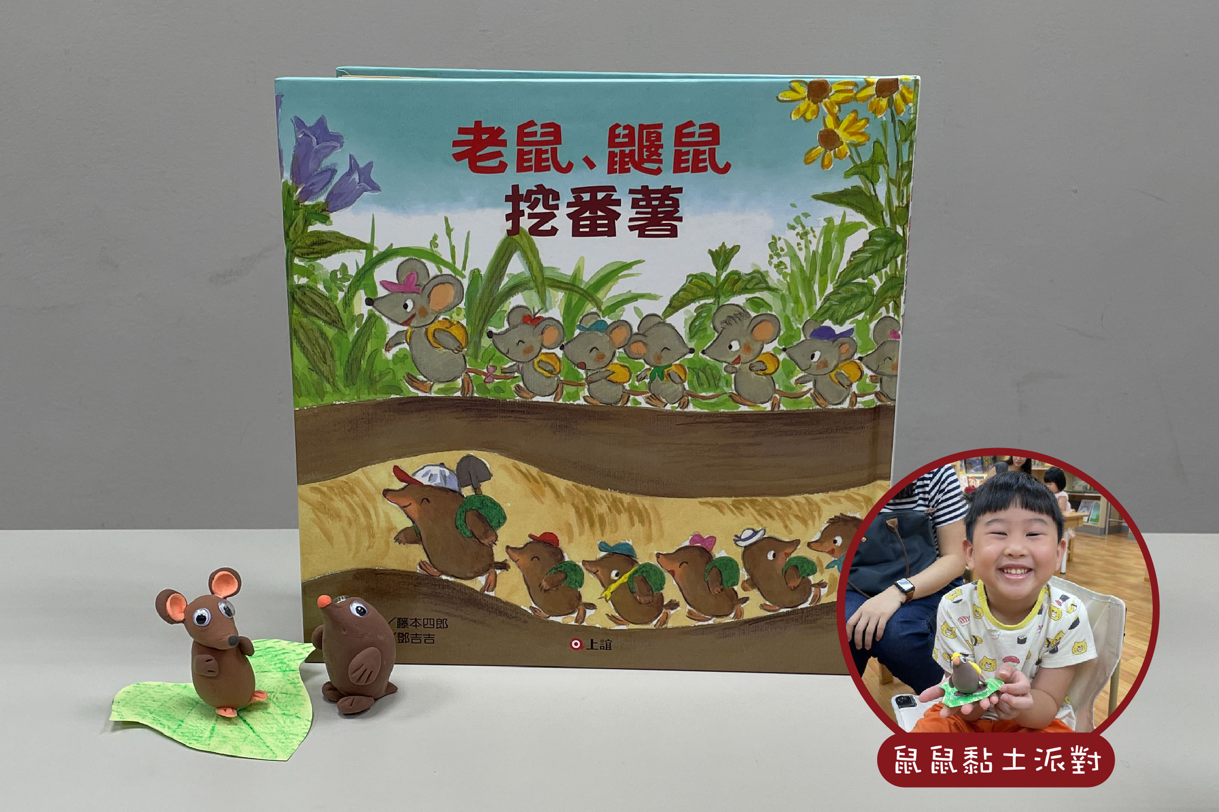 來聽故事囉《老鼠鼴鼠挖番薯》鼠鼠黏土派對(台中場)今天的天氣非常好,老鼠幼兒園的小朋友,背上背包,出發去遠足囉!同一時間,住在地下的鼴鼠幼兒園也出發了! 他們各自穿過樹幹隧道、鑽過地底的通道後……咦,前方好像發現了好吃的東西耶? 聽完故事用黏土,透過搓圓、壓扁等技法,從一顆小地瓜,變變變成可愛的老鼠或是鼴鼠,給你來決定!