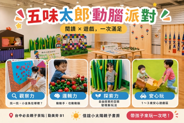 五味太郎的動腦派對(台中場)邀請親子一起來《創意的遊戲書》大考驗,挑戰邏輯與觀察力 ;《小雞逃跑記》探索區,用身體走進故事 ;《小金魚逃走了》寶寶遊戲區,體驗視覺追蹤樂趣;現場還有說故事、創意DIY,陪你打開感官、動手動腦挑戰極限,享受最棒的親子時光。