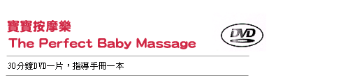 在這片DVD中,您可以了解按摩前需要做哪些準備、身體每個部份的按摩手法,以及各種按摩對寶寶發展的功能,同時認識紓解寶寶身體不適的幾種簡易按摩法,讓您的寶寶充滿活力,情緒安穩。